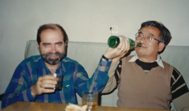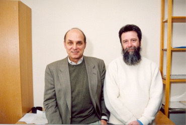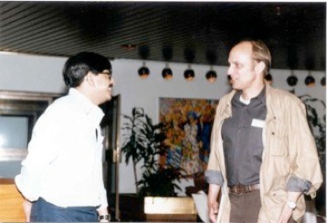 A picture of me with Andreas Ringwald shown in the picture above on the right was taken at a meeting in Telavi, Georgia. The meeting was a very interesting one. The issue of whether or not one produced spectacular events in high energy collisions of weakly interacting particles was hotly contested, and almost everyone working on the problems was there. In the night, after the regular meeting, we would sometimes hold discussions in the cellar of the hotel. There would be much Georgian wine and Scotch Whiskey. The discussion would sometimes be very agitated, but all done in good spirit.