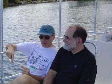 Brazil is a wonderful place to meet colleagues from around the world. I regularly have met colleagues from France, Germany, Italy, and India. Below are some photos taken from a meeting in 2004, which was held in an eco-hotel on the coast between Rio and Sao Paolo. The one on the left is Ulrich Heinz from Ohio State University, and Edmond Iancu from Paris. The one on the right is me and Jean Paul Blaizot from Paris. In the photo with Jean Paul, we are on the little boat which took us to a beach where we could swim in the morning. The photo on the left is at night during dinner. At night, the yard in front of the hotel would be full of very large rodents, the capybara. I show one below. They are real.