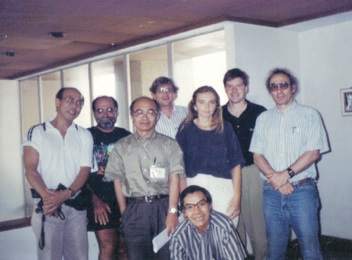 Upper Left: Takeshi Kodama, me, Yogiro Hama, Johann Rafelski, K. C. Chung, Gradzhina Odyniec, Wolfgang Bauer and Gordon Baym at an early Relativistic Aspects of Nuclear Physics