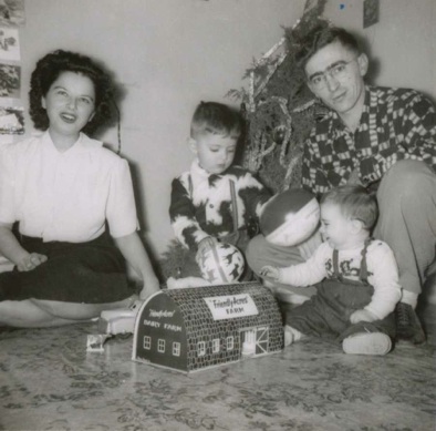 Left: Dennis, me, mom and dad on Christmas when I was about 3 and Dennis was 1